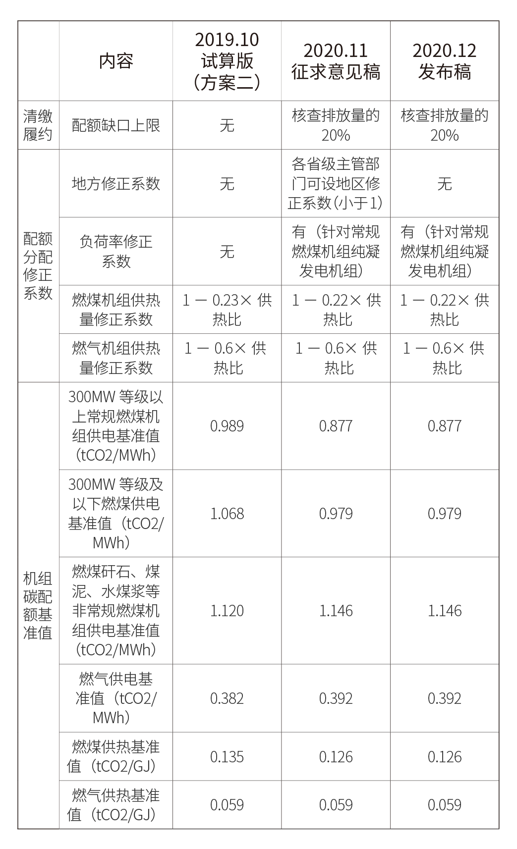 在《分配方案》正式發布之前,生態環境部曾在11月20日公開發布該方案的征求意見稿及其編制說明,征求意見時間至2020年11月29日止。仔細研讀可見,《分配方案》的變與不變如下:一、主要變化1、暫不設地區修正系數征求意見稿中曾引入一個地區修正系數(小于1)作為配額分配調節的參數:“考慮到各地區實現其控制溫室氣體排放行動目標的需要,各地區可結合本地實際通過地區修正系數收緊本地區配額”。然而該參數也引起了市場主體公平與電力市場化改革方面的討論,最終此次發布的分配方案暫不設地區修正系數。2、納入配額管理的重點排放單位征求意見稿中納入配額管理的重點排放單位名單以“發電行業(含其他行業自備電廠)2013-2018 年任一年排放達到2.6 萬噸二氧化碳當量”為篩選條件,此次分配方案終稿中將納入全國配額管理的重點排放單位篩選年份調整為“2013-2019年”。此前,生態環境部組織各地開展了2013-2019 年度重點排放單位碳排放數據報送與核查工作。受疫情等因素影響,排放數據收集進度緩慢,根據上年度(2019 年度)數據形成的重點排放單位名單也無法確定。如今時間已至2020年底,2019 年度數據進入收尾工作,歷史數據年份和納入企業名單也理應確認。根據篩選結果,2019-2020 年全國碳市場納入發電行業重點排放單位共計2225 家,較征求意見稿中的2267 家減少了42家。3、體現溫室氣體和污染物的協同管理《分配方案》正式發布稿較征求意見稿增加了一條不予發放及收回免費配額的情形:“未依法申領排污許可證,或者未如期提交排污許可證執行報告的”。這條變化再次體現出2018年機構改革以來生態環境部不斷在加強溫室氣體和污染物的協同管理。在本月生態環境部例行發布會中,生態環境部新聞發言人也披露了部門已制定《關于統籌和加強應對氣候變化與生態環境保護相關工作的指導意見》擬于近期印發實施,相信未來碳排放管理與生態環境保護相關工作的監督檢查協同力度將進一步加深。二、不變之處除以上幾點內容以外,《分配方案》中關于納入機組類型與判定標準、配額分配方法與清繳規則、各類機組的碳排放基準值等核心要素均與上一版征求意見稿保持一致。2019年以來,生態環境部公開發布過三版《分配方案》,分別是:(1)2019年10月生態環境部組織能力建設培訓中發布的《2019年度分配方案(試算版)》(方案二);(2)2020年11月《2019-2020年度分配方案》征求意見稿;(3)2020年12月《2019-2020年度分配方案》正式發布稿。其中主要區別如下:表1 《分配方案》歷史版本比較