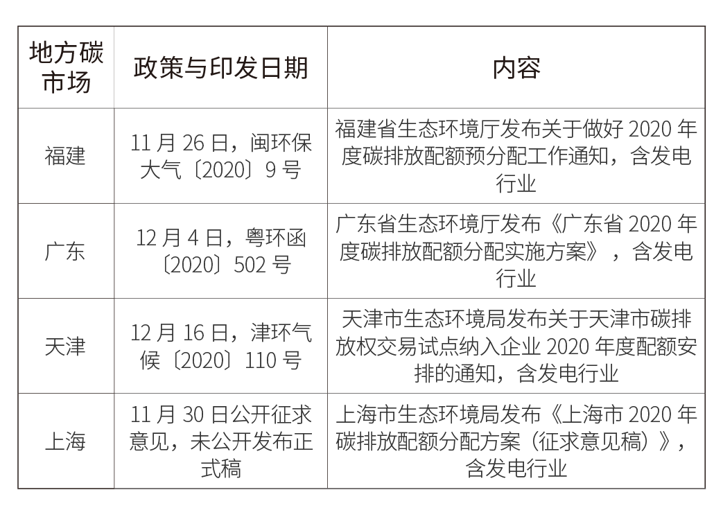 *根據相關報道,較多電力企業尚未在2018年度對燃煤單位熱值含碳量和碳氧化率采用實測,在當年度排放量核算時采用了懲罰性高限值,因此試算版的分配方案配額基準線相對較寬松,而在2019年度的核查中大部分企業已采取實測數據。《分配方案》簡評:1、《分配方案》發布吹響了全國碳市場最后沖刺的號角2020年9月以來,關于全國碳市場的法律基礎、交易管理、配額分配、排放報告與核算、核查等核心內容文件不斷發布,全國碳市場的政策逐漸明朗。作為碳市場核心要素的配額分配一直是各方關注的焦點,《分配方案》在“十三五”收官之際出臺,可謂吹響了全國碳市場沖刺的號角。本次通知同時要求各省級生態環境主管部門按照要求于2021年1月29日前提交發電行業重點排放單位配額預分配相關數據表。這些信號彰顯了主管部門貫徹落實中央經濟工作會議部署做好碳達峰、碳中和工作的決心。目前看來,全國碳市場有望在明年進入實質運行階段。2、后續需要關注地方碳市場中的重點排放單位《分配方案》指出“對已參加地方碳市場2019年度和2020年度配額分配的重點排放單位,暫不要求其參加全國碳市場2019年度和2020年度的配額分配和清繳。本方案印發后,地方碳市場不再向納入全國碳市場的重點排放單位發放配額。”因此,對于尚未發布2020年度配額分配方案的地方碳市場,發電企業應當已確定進入全國碳市場完成下一年度配額分配和清繳。截止2020年12月30日,福建、廣東和天津三個地方碳市場已公開發布了2020年度分配方案或已開展預分配工作,(擬)分配對象均包括發電行業。但本次通知中《納入2019-2020年全國碳排放權交易配額管理的重點排放單位名單》也包括這些(擬)納入地方碳市場的發電企業。這些企業是否應參加全國碳市場2020年度的配額分配和清繳,似乎仍有待最終確認。表2部分地方碳市場2020年度配額分配情況(截止2020.12.30已公開信息)